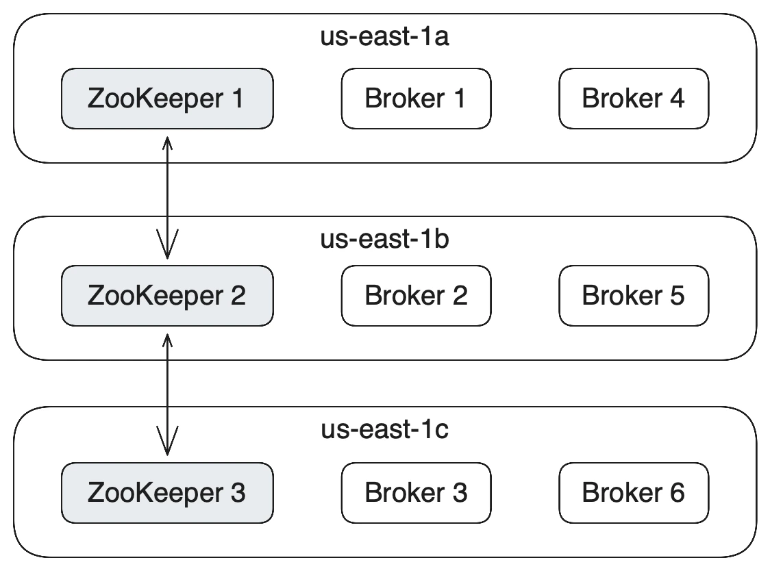 At a bare minimum, a realistic Kafka cluster should have the following architecture:- To make the cluster highly available and performant, you want multiple brokers in different data centers (racks) to distribute your load. If you are setting up your cluster in AWS, this will be at least three different availability zones.
