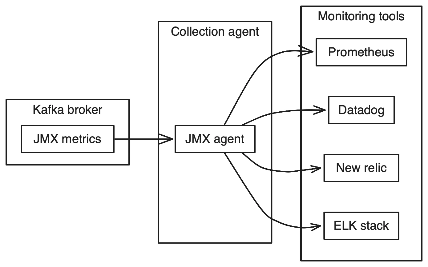Kafka runs on the JVM and exposes all metrics via Java Management Extensions (JMX). You can collect these metrics using agents that attach to the Kafka process.