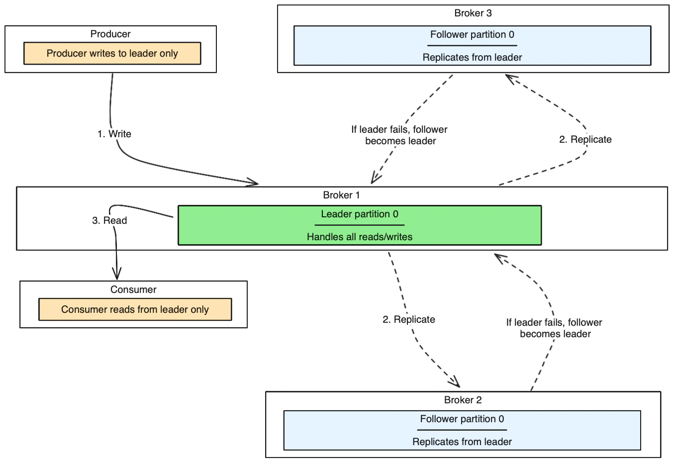 - Followers replicate data from the leader