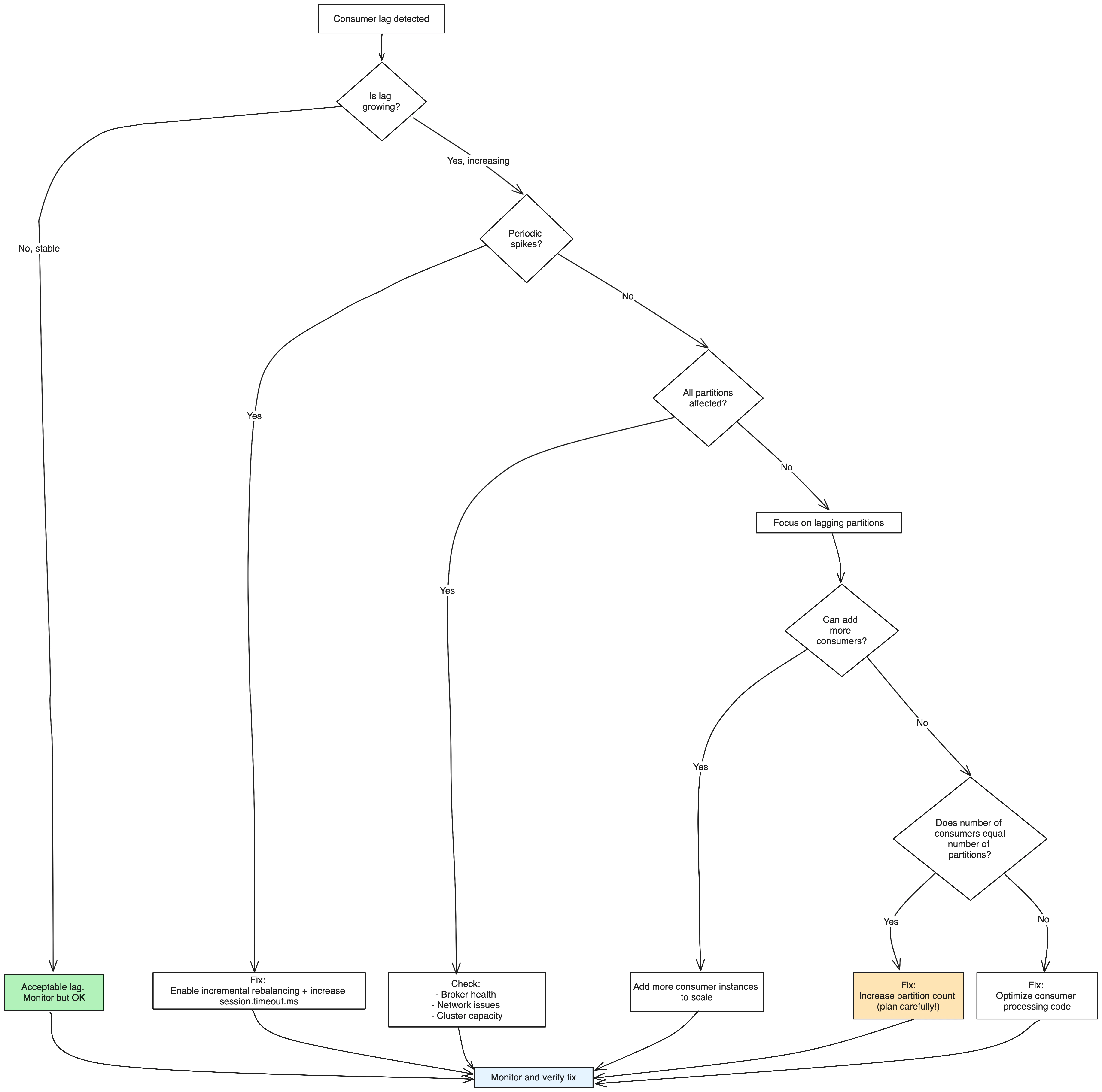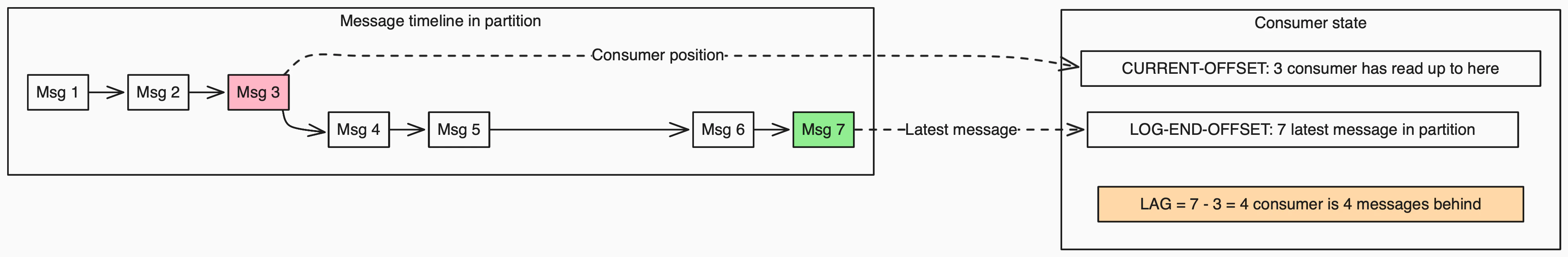 - LAG > 0 and stable: Consumer is behind but processing consistently